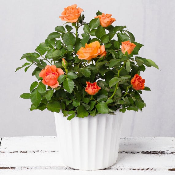 Add a burst of colour to any space with a radiant orange Rose plant delivered in a reactive glaze pot. Please note – Rose shade may vary slightly from image. This plant measures approximately: W14cm x H32cm